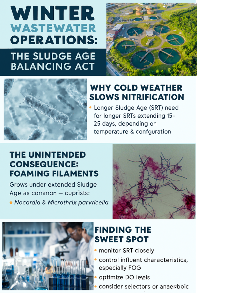 Winter operations demand a nuanced approach to sludge age management. While longer SRTs are essential for maintaining AOB and NOB populations, they can also tip the scales toward filamentous foaming if left unchecked. By understanding the microbial dynamics and implementing targeted controls, operators can keep their systems running smoothly — even when the mercury drops.