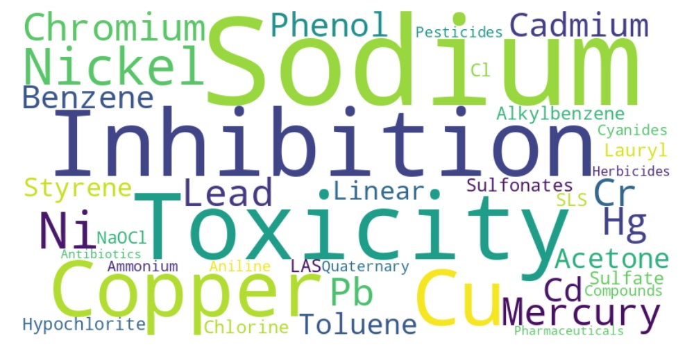 Heavy Metals | Copper (Cu), Nickel (Ni), Chromium (Cr), Lead (Pb), Mercury (Hg), Cadmium (Cd) | Highly toxic, they denature enzymes and disrupt cellular processes even at low concentrations, particularly affecting nitrifying bacteria (which are critical for nitrogen removal). Also tend to bioaccumulate in biofilms/floc. |