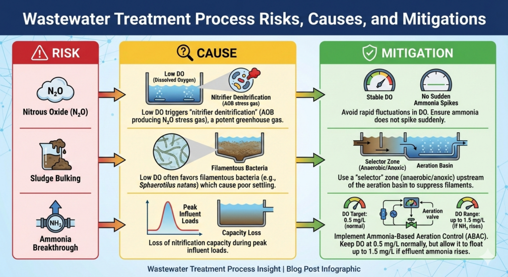 | Nitrous Oxide (N₂O) | Low DO triggers “nitrifier denitrification” (AOB producing N₂O stress gas). This is a potent greenhouse gas. | Avoid rapid fluctuations in DO. Ensure ammonia does not spike suddenly. |